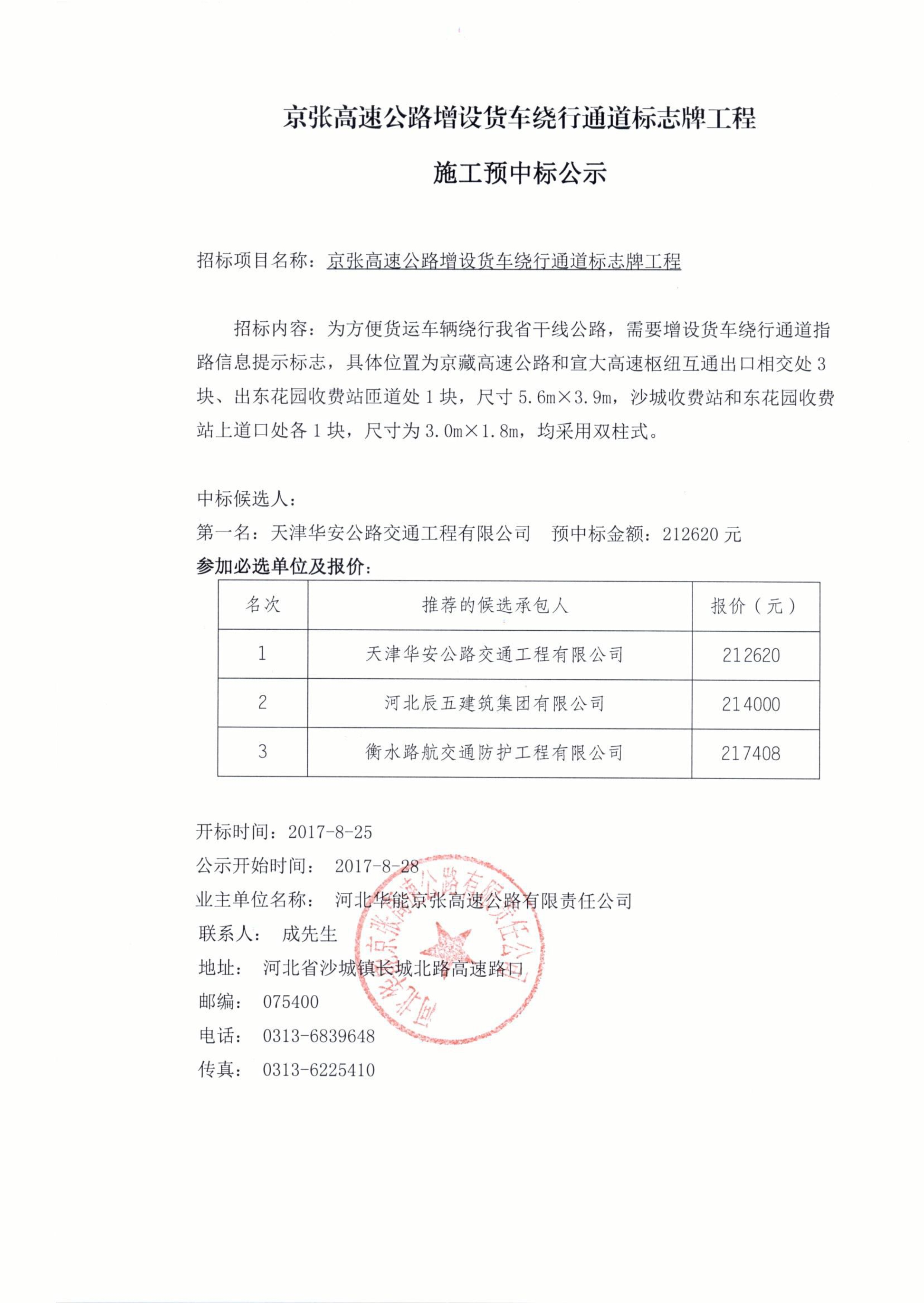 京張高速公路增設貨車繞行通道標志牌工程施工預中標公示