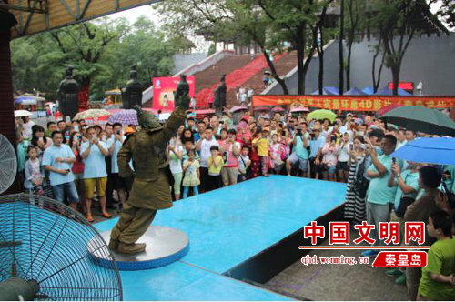 2016年7月7日,記者來到秦皇求仙入海處。在求仙殿廣場的東南方舞臺,伴著富有節(jié)奏感的音樂響起,“泡泡大叔”的街舞表演準時開始。他穿著皮質(zhì)的兵馬俑服裝,蹬著黑色軍靴,臉上涂滿灰色油彩。只見他雙腳不動,雙手舞動前伸,身體前傾與地面成45度。固定幾十秒后,身體慢慢復(fù)位站直,又隨著音樂跳起了街舞。大約半個小時后,汗如雨下的“泡泡大叔”沖到電扇前吹風,一口氣喝下2瓶藿香正氣水,又跑回舞臺繼續(xù)表演。