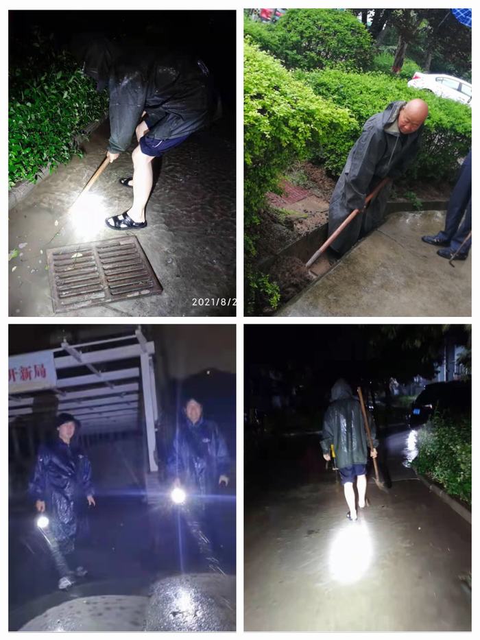 暴雨來襲,傾盆的大雨沒有影響物業(yè)人的堅守,他們在小區(qū)的每條道路上不間斷來回巡查,排查道路積水情況和下水口的疏通情況。他們疏通下水口,或一遍遍重復(fù)著掃雨,雨不停,他們不停。雨水短暫的停歇后又是一場暴雨,他們身上被淋濕的衣物還未干,卻又義無反顧奔波在小區(qū)的每條路上,為行人車輛出行保駕護航。